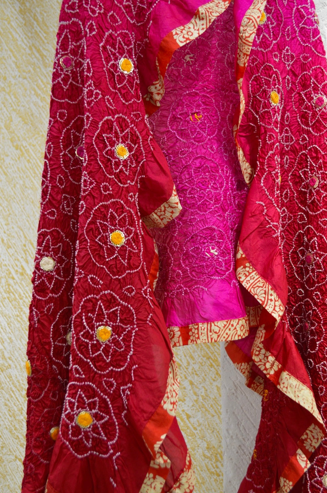 Flower Bandhani Dupattas artfully combine classic Bandhani dyeing methods with elaborate floral designs. Adorned with intricate botanical patterns, these Dupattas bring a vibrant splash of color and cultural depth to both traditional and contemporary wardrobes.