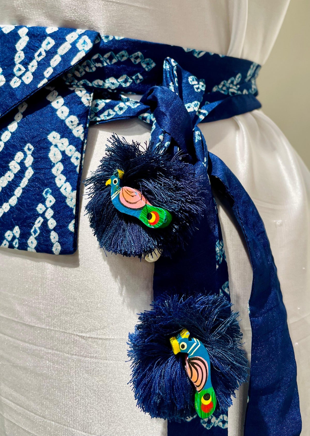 INDIGO BLUE SILK WAIST BAG WITH HANDMADE TASSELS