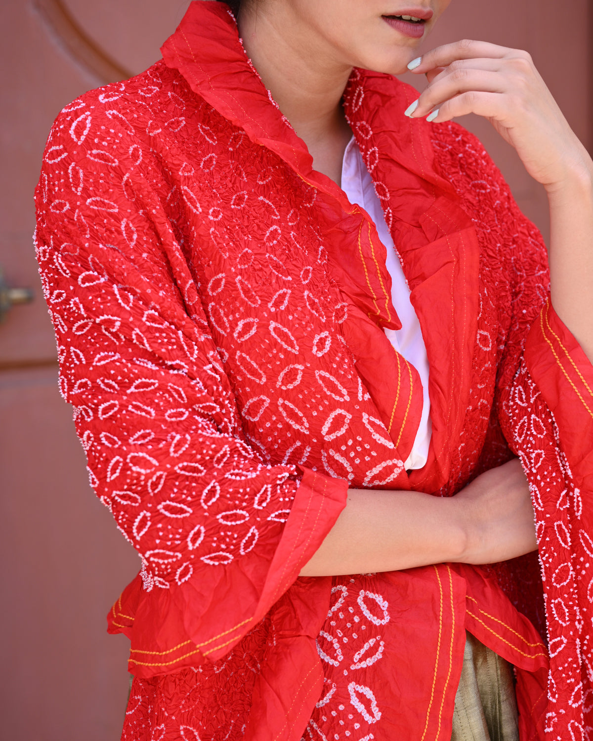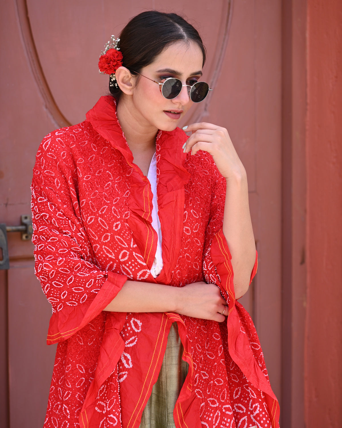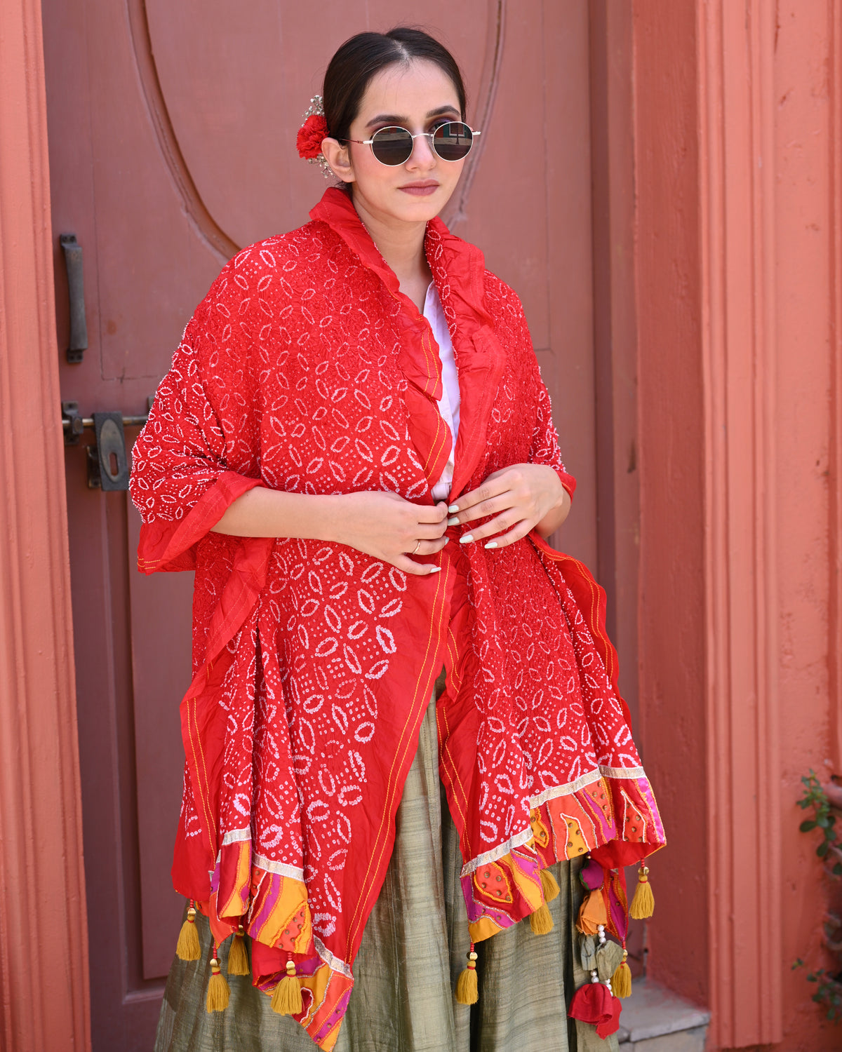 RED FLOWER BANDHANI SILK DUPATTA WITH BEAD WORK AND TASSELS