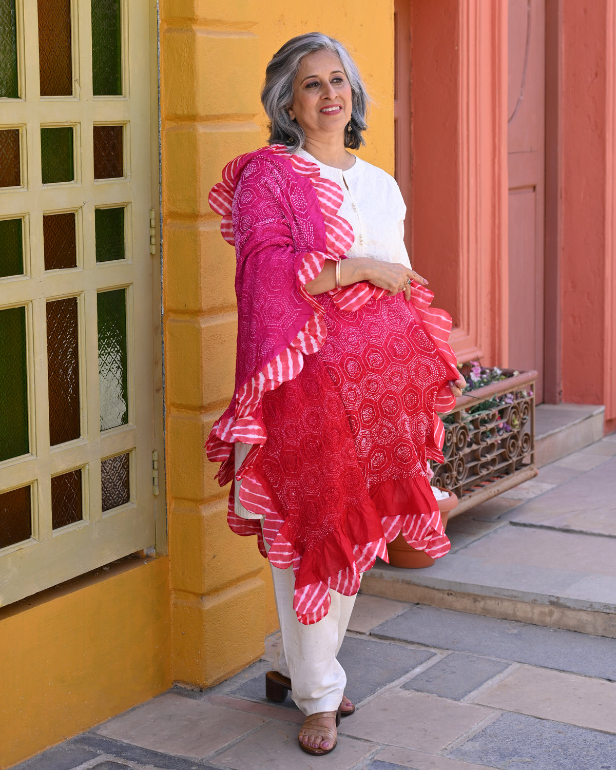 PINK-RED HONEYCOMB GEOMETRIC BANDHANI SILK DUPATTA WITH LEHERIYA SCALLOP BORDER