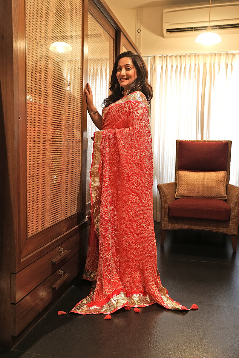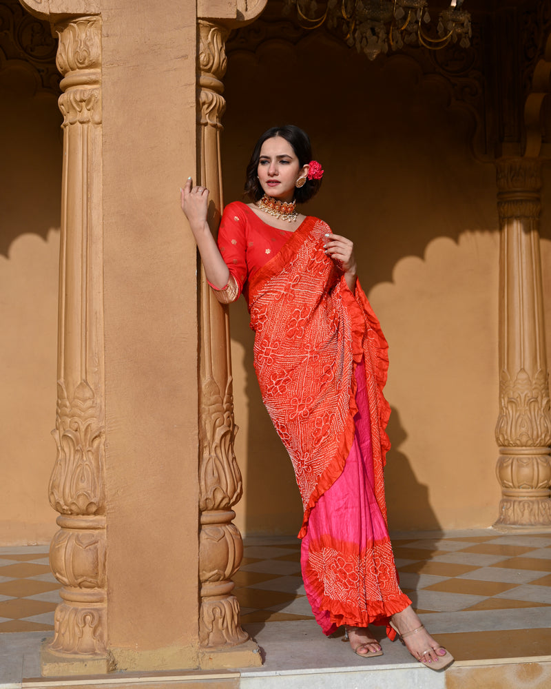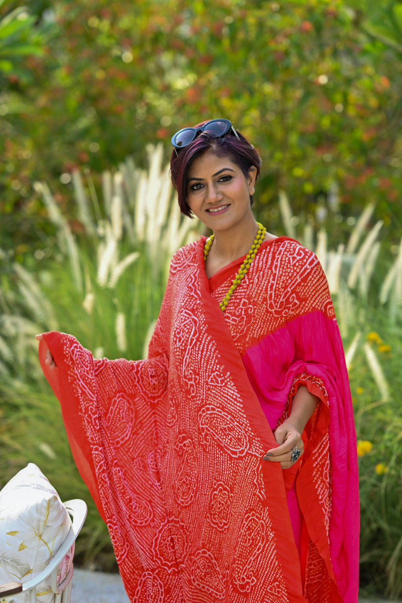 PINK-ORANGE YIN-YANG HALF FULL HALF EMPTY POPPY FLOWER BANDHANI SILK SAREE