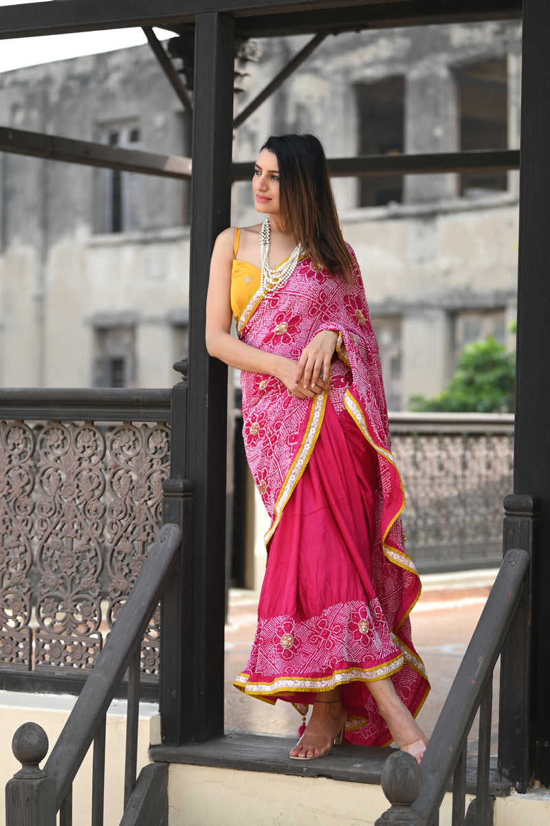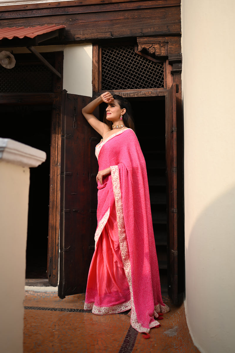 PINK YIN-YANG HALF FULL HALF EMPTY POPPY FLOWER BANDHANI SILK SAREE WITH SEQUIN WORK AND LAMPI BORDER