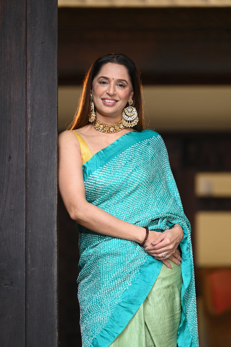 GREEN-BLUE YIN-YANG HALF FULL HALF EMPTY ETERNAL DOT BANDHANI SILK SAREE