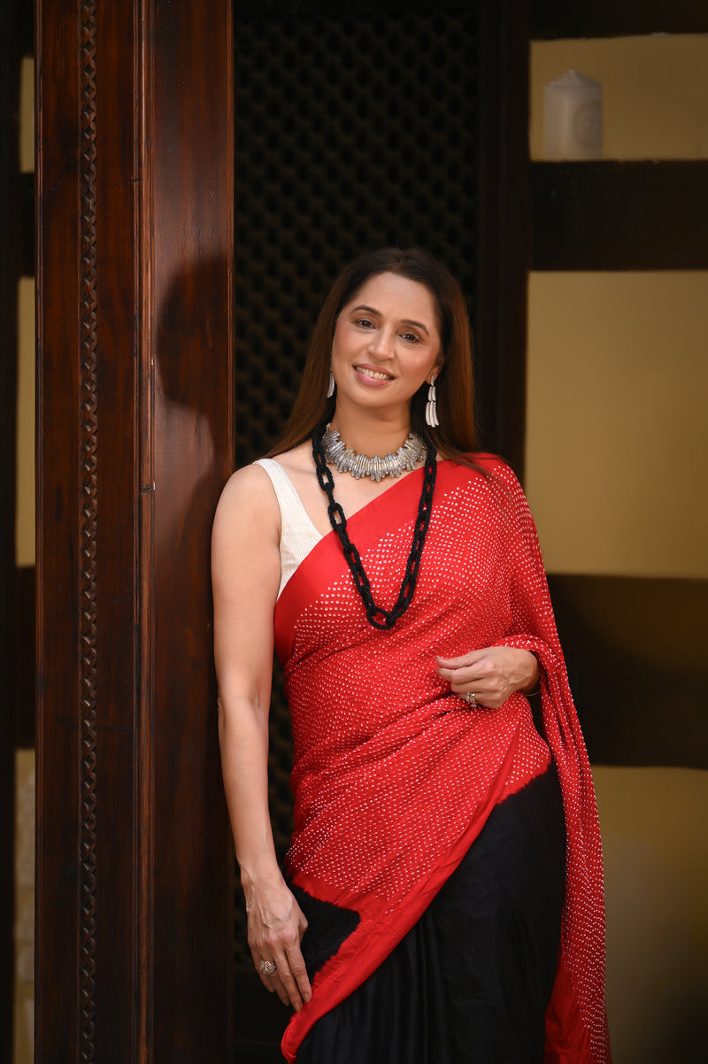 RED-BLACK YIN-YANG HALF FULL HALF EMPTY ETERNAL DOT BANDHANI SILK SAREE