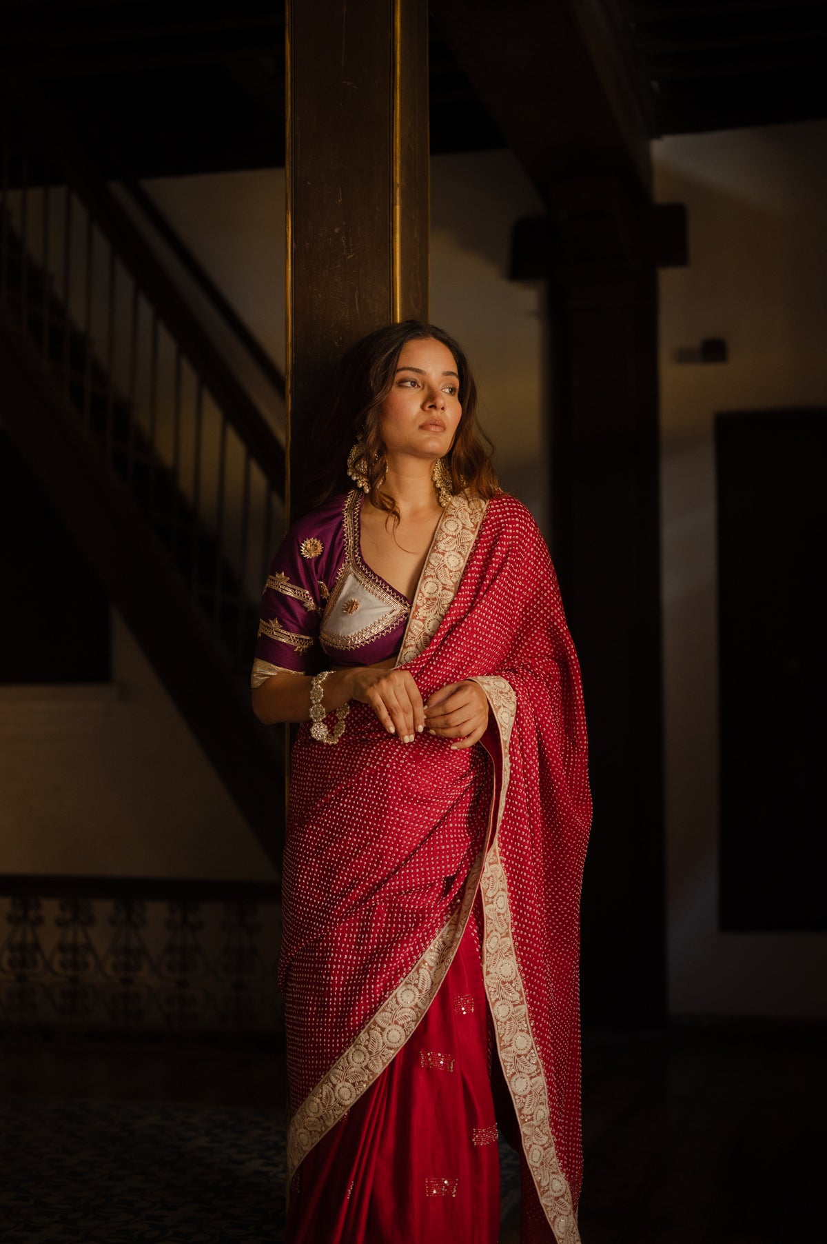 The blouse used on the model is not inclusive; a bandhani silk blouse is included with the saree.