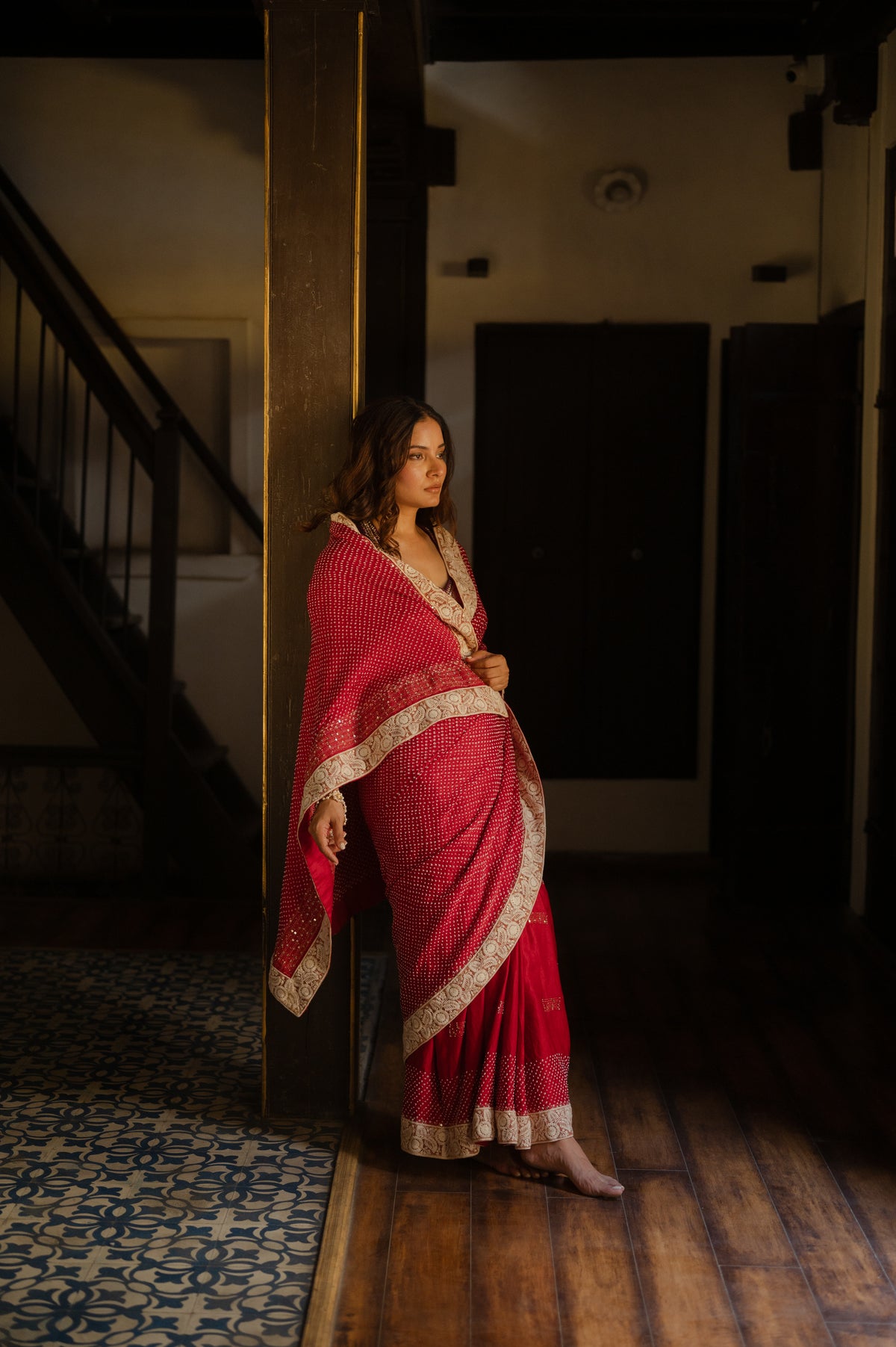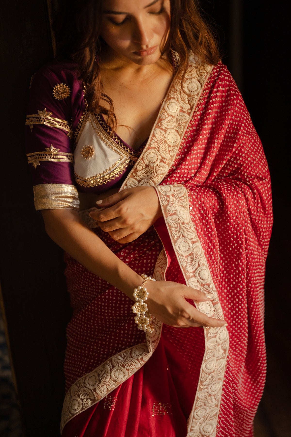 RED YIN-YANG” HALF FULL HALF EMPTY ETERNAL DOTS SILK BANDHANI SAREE WITH EMBROIDERY AND EMBROIDERED LACE